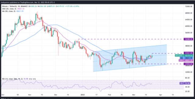 Kanalın orta çizgisine yakın seviyede denge bulan Bitcoin fiyatı, bu yazının hazırlandırdığı esnada 42.180 dolar civarında hesaplanıyordu.