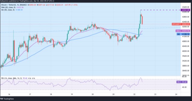 Bitcoin fiyatı 42.300 ila 40.500 dolar arasında işlem gördükten sonra birkaç saat içinde 2 bin dolardan fazla artış gösterdi.