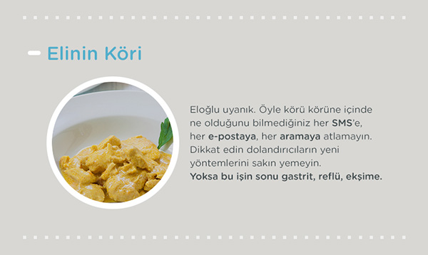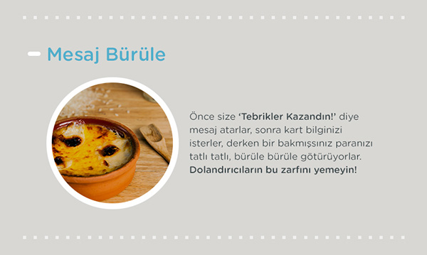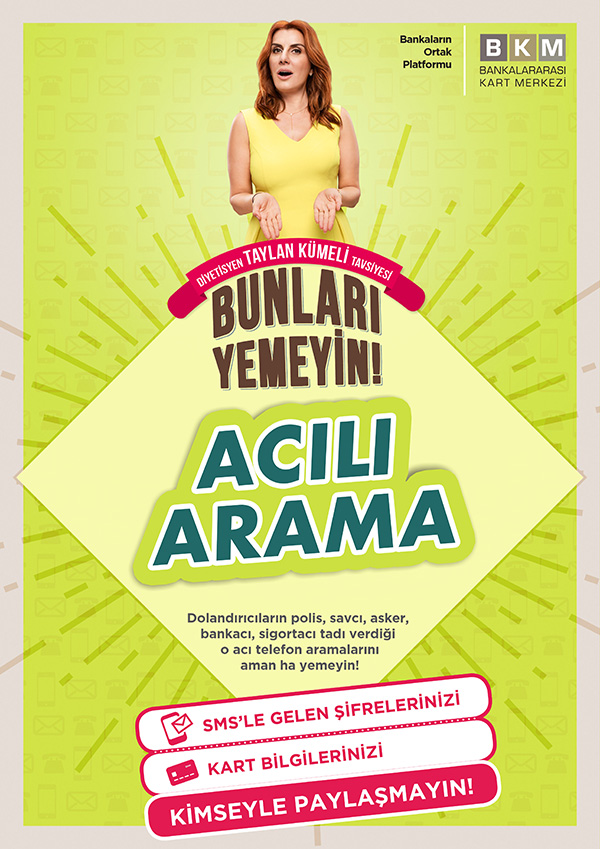 BKM’nin, kart kullanıcılarını farklı ikna yöntemleri kullanarak dolandıran kişilere karşı bilinçlendirmek amacıyla başlattığı “BUNLARI YEMEYİN” kampanyası büyük ilgi görüyor. Bu tür sosyal mühendislik yöntemleri ile geliştirilen dolandırıcılık olaylarına karşı tebessüm ettiren bir iletişim yolu kullanarak, ünlü diyetisyen Taylan Kümeli'nin "BUNLARI YEMEYİN!" dediği kampanya ile amaç, kart kullanıcılarını dolandırıcılık yöntemlerine karşı bilinçlendirerek, SMS’le gelen şifreler ile kart bilgilerini başkaları ile paylaşmalarını engellemek.