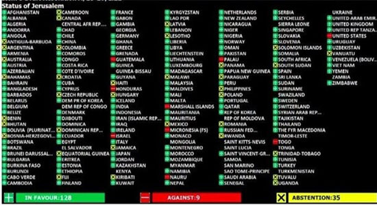 Birleşmiş Milletler'de (BM) Genel Kurulu'nda ABD'nin Güvenlik Konseyi'nde veto ettiği Kudüs tasarısı kabul edildi. 128 ülke kabul, 9 ülke ret, 35 ülke çekimser oy kullandı.