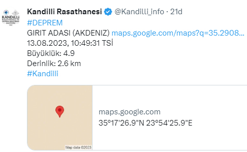 Boğaziçi Üniversitesi Kandilli Rasathanesi ve Deprem Araştırma Enstitüsü ise depremin şiddetini 4.9 olarak açıkladı.