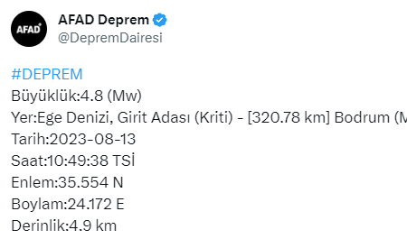 İçişleri Bakanlığı Afet ve Acil Durum Yönetimi Başkanlığı (AFAD) verilerine göre; Bodrum açıklarında saat 10.49'da 4.8 şiddetinde bir deprem meydana geldi.