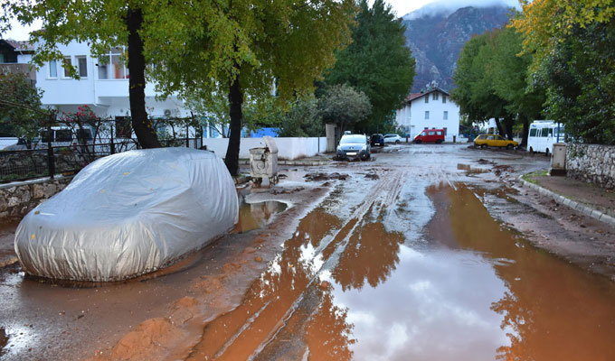 İçmeler Mahallesi'nde yoğun yağış nedeniyle dereler taştı. Dağlardan gelen çamur, irili ufaklı taş ve ağaç parçaları sokaklara kadar ulaştı.
