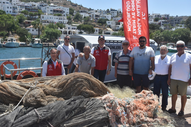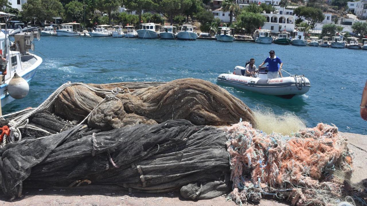 Yaklaşık iki saat süren çalışmanın ardından denizden çıkarılan 8 bin metrekare hayalet ağ, tekneyle Türkbükü Balıkçı Barınağı'na getirildi.