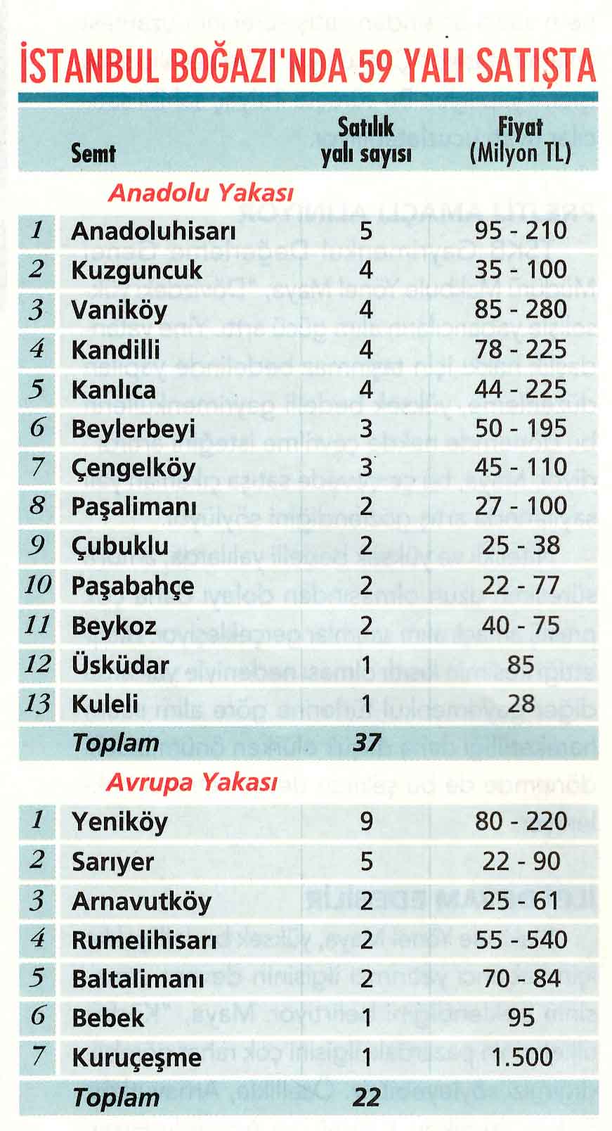 Türkiye'nin hatta dünyanın en pahalı bölgelerinden biridir İstanbul Boğazı. Öyle ki İstanbul Boğazı'nda milyon dolarlara satılan yalı fiyatlarıyla Avrupa ülkelerinde şato satın almak mümkün. Yalılar daha çok hükümetlerin değiştiği dönemlerde satışa çıkar ve Boğaz hattının sakinleri de değişir. Kimi zaman yalı sahipleri çocukları miras kavgası yapmasınlar diye yalılarını satar. Ancak Türkiye'nin içinde bulunduğu sıkıntılı süreç yalı satışlarına da yansımış durumda. Geçmişte satışa çıkan yalılar kısa sürede yeni sahipleriyle buluşurdu. Günümüzde ise satışa çıkan yalıların müşteri bulma sürelerinin bir yıla kadar uzadığı ifade ediliyor. Bu yüzden de satılık yalı sayısının birikip 59'a ulaştığı belirtiliyor.