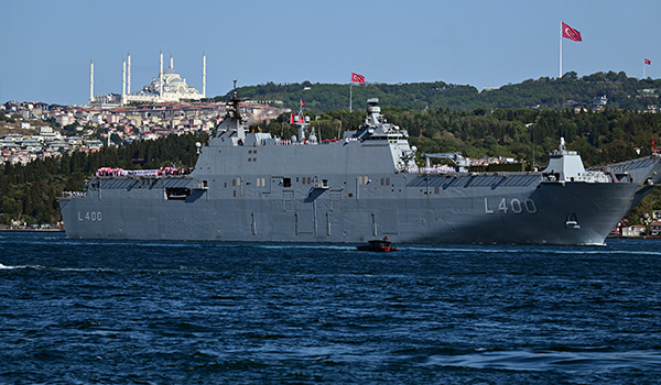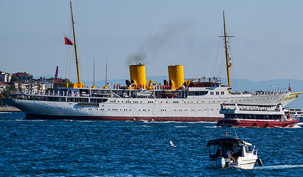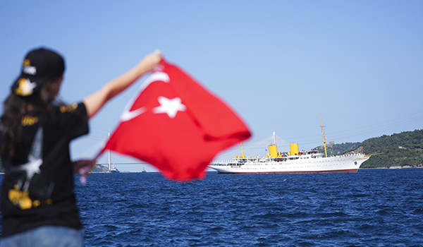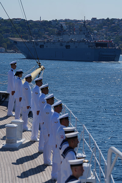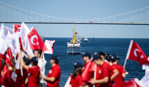 Türkiye'nin yerli imkanlarla geliştirdiği askeri gemi TCG Anadolu, Cumhuriyet'in kurucusu Gazi Mustafa Kemal Atatürk'ün manevi mirası TCG Savarona ile TCG Oruçreis, TCG İstanbul, TCG Heybeliada, TCG Kalkan, TCG Alanya, TCG Sancaktar ve TCG Hızırreis denizaltısı TEKNOFEST Mavi Vatan kapsamında İstanbul Boğazı'ndan geçti.
