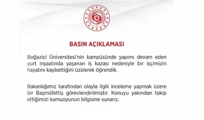 Açıklamada, "Boğaziçi Üniversitesi'nin kampüsünde yapımı devam eden yurt inşaatında yaşanan iş kazasında 1 işçimizin hayatını kaybettiğini üzülerek öğrendik. Bakanlığımız tarafından olayla ilgili inceleme yapmak üzere bir Başmüfettiş görevlendirilmiştir.