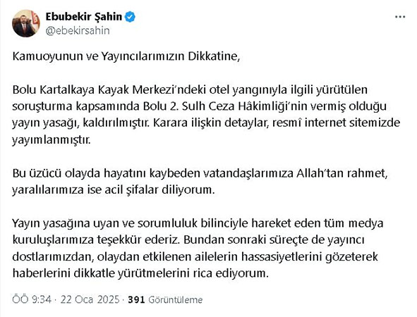 "Bolu Kartalkaya Kayak Merkezi'ndeki otel yangınıyla ilgili yürütülen soruşturma kapsamında, Bolu 2. Sulh Ceza Hakimliğinin vermiş olduğu yayın yasağı kaldırılmıştır. Karara ilişkin detaylar, resmi internet sitemizde yayımlanmıştır. Bu üzücü olayda hayatını kaybeden vatandaşlarımıza Allah'tan rahmet, yaralılarımıza ise acil şifalar diliyorum. Yayın yasağına uyan ve sorumluluk bilinciyle hareket eden tüm medya kuruluşlarımıza teşekkür ederiz. Bundan sonraki süreçte de yayıncı dostlarımızdan, olaydan etkilenen ailelerin hassasiyetlerini gözeterek haberlerini dikkatle yürütmelerini rica ediyorum."