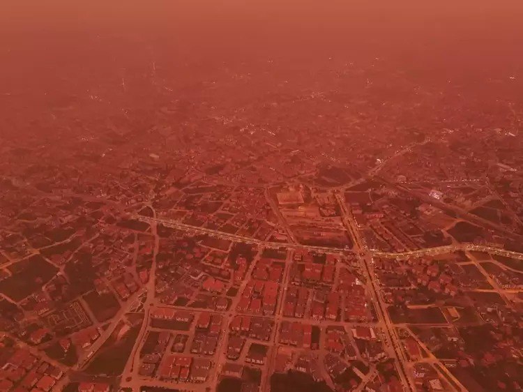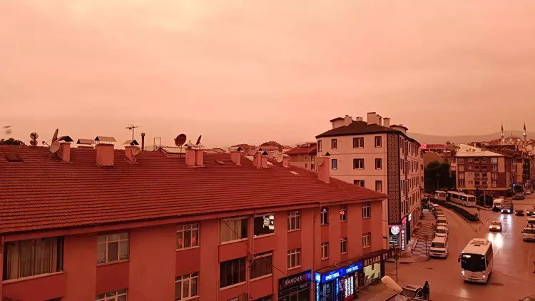 Toz taşınımı nedeniyle akşam saatlerinde kentte gökyüzü kırmızı renge büründü.