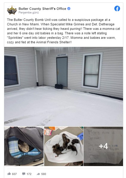 ABD'nin Ohio eyaletinde Butler County Şerif Ofisi'ne kilisenin dışında şüpheli bir çanta olduğu ihbarı yapıldı. İhbar üzerine adrese giden bomba birimi çantada bir kedi ve 1 günlük 6 yavrusunu buldu.