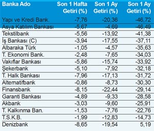 Avrupa ülkelerine ilişkin güven kaybının artması, borsada en çok banka hisselerini vurdu. İMKB 100 Endeksi son bir ayda yüzde 7.28 değer kaybederken banka hisseleri yüzde 12.61 düştü. Banka hisselerinin yılbaşından bu yana değer kaybı ise yüzde 32.83 oldu. En fazla değer kaybeden banka hisseleri Yapı ve Kredi Bankası, Asya Katılım Bankası, Tekstilbank ve İş Bankası C oldu.