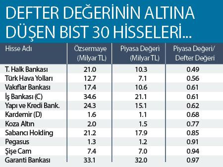 Borsa İstanbul, 15 Temmuz sonrasında yaşanan dalgalanmayla hâlâ 82.825 seviyesinin yüzde 8 altında bulunuyor. BİST 100 Endeksi 82.825’ten 70 binlere geriledikten sonra 76 binlere yeninden tırmandı ancak hisselerdeki kayıplar henüz telafi edilmiş değil. Türkiye’nin en büyük banka ve holdingleri defter değerinin altında işlem görüyor. Avrupa’nın en iyi havayolu şirketi seçilen Türk Hava Yolları yüzde 56 oranındaki piyasa değeri ile işlem görüyor. 21 milyar TL olan Halkbank’ın piyasa değeri yarısına geriledi. BİST 30 Endeksi’nde ağırlığı yüksek 11 hisse, defter değerinin altına kayınca Borsa İstanbul’un da toparlanması güç oldu. Geçmiş istatistikler hisse senetlerinin defter değerlerinin altında işlem görmelerinin geçici bir durum olduğunu gösteriyor. Bu nedenle darbe girişimi sonrasında normalleşme sürecinde bu hisselerde hızlı fiyat hareketleri görülebilir.