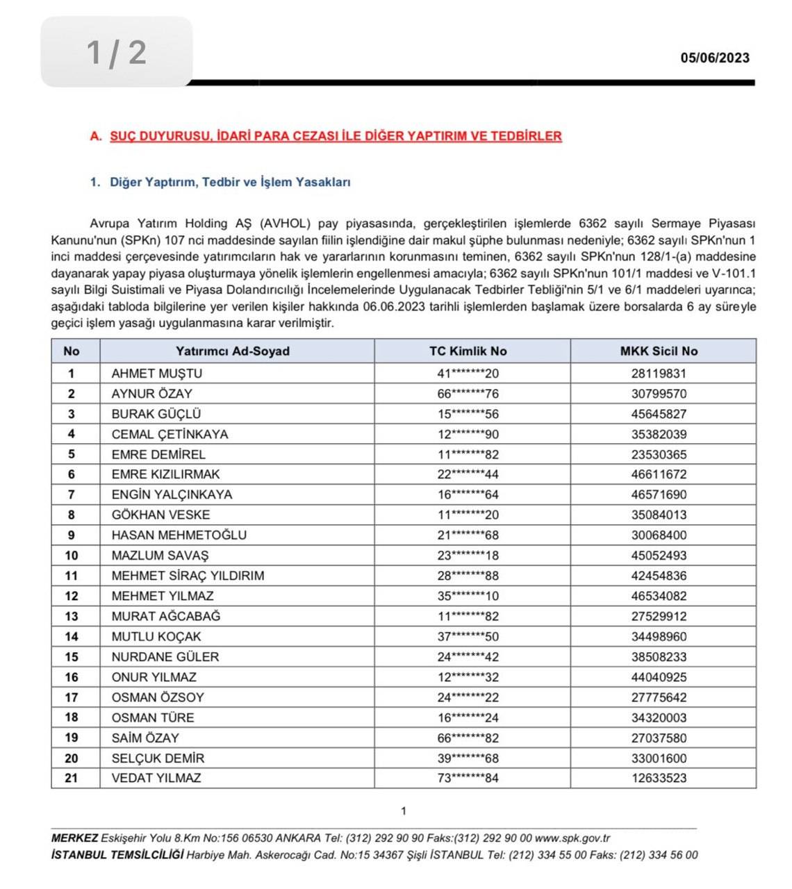 Öte yandan, Avrupa Yatırım Holding (#AVHOL) hisselerinde 2023 yılında yapay piyasa oluşturarak yatırımcıları mağdur etmemesi için yasak getirilen Onur Yılmaz, beraberindeki çok sayıda ismi de yasaklılar listesine sokmuştu.