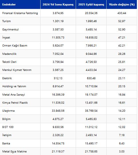 ABD yönetiminin uyguladığı "karşılıklılık esaslı" tarifelere ilişkin belirsizliklerin azalması ve yurt içinde faiz indirim sürecine ilişkin beklentilerin güçlenmesiyle yükselişe geçen endeks, haziran, temmuz ve ağustosu artıda tamamlarken, ağustos ayında 11.605,30 ile rekor kırdı. Endeks eylülde ise değer kaybetti.
