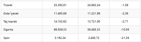 En çok değer kaybeden sektör endeksi ise yüzde 21,39 ile spor oldu. Bu sektörü yüzde 10,56 ile sigorta, yüzde 2,71 ile taş toprak, yüzde 2,38 ile gıda ve içecek, yüzde 1,59 ile ticaret endeksleri izledi. Bu dönemde 14 sektörün ise BIST 100 endeksinden daha fazla yükseldiği görüldü.