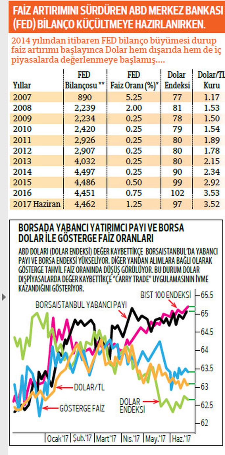 Son dönemde daha çok “üzümünü ye, bağını sorma” türünden yaklaşımlar söz konusu. Dışarıdan gelen portföy yatırımlarında ağırlığın yüksek faiz nedeniyle tahvil ve bonoda olması önemli bir gösterge. Bu aşamada sebep şu veya bu, piyasalar bu avantajı kullanmaya devam ediyor, olağan dışı bir gelişme olmazsa mevcut görünüm bir süre daha korunacak gibi. Dolar ve bazı gelişen ülke para birimlerinin seyri, petrol fiyatlarındaki düşüş, ABD Merkez Bankası (Fed) kaynaklı gelişmeler, Ortadoğu, siyaset, dış borsalar, varlık fonuna ilişkin dış kaynak arayışlarının sürdüğüne dair spekülasyonlar, kredi derecelendirme kuruluşu Fitch’in Türkiye’nin büyüme tahminlerini yukarı çekmesi ve not artırım beklentilerinin dillendirilmesi öne çıkan gündem konuları.