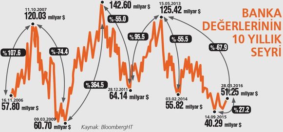 - Hemen belirtelim ki, bizim 100 milyar dolar dediğimiz bankaların toplam piyasa değeri aslında 125.4 milyar dolardan düşmeye başlamış. Bunun tarihi Mayıs 2013. Bu ay, ekonomide hemen her şeyin tavan yaptığı, Türkiye’nin kredi notunun 18 yıllık aradan sonra yeniden yatırım yapılabilir düzeye yükseldiği, dışarıdan sermaye girişlerinin rekora çıktığı ve sıcak para stokunun 158.5 milyar dolara vardığı, borsanın da tüm zamanların en yüksekliğini gördüğü bir aydı. Bankaların toplam değeri 125.4 milyardan Eylül 2015 ortasında 40.3 milyar dolara kadar indi. Son piyasa değeri olan 51.2 milyar dolar aslında yüzde 27 yükselmiş değeri gösteriyor. Bankaların son düşüşünde en yüksekten en düşüğe 85 milyar dolarlık kayıp meydana geldi. Düşüş oranı da yüzde 67.9 ile küresel krizden bu yana en yükseğine çıktı.