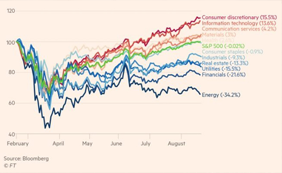 ABD'de borsanın bu yıl yakaladığı çıkış Apple ve Amazon gibi ülkenin en büyük şirketleri tarafından desteklendi. Teknoloji devleri, salgından yararlanan Calgote-Palmolive ve Domino's gibi şirketlerle birlikte zirveyi gördü. Ancak endeksteki çoğu firma ciddi düşüş yaşamış durumda.