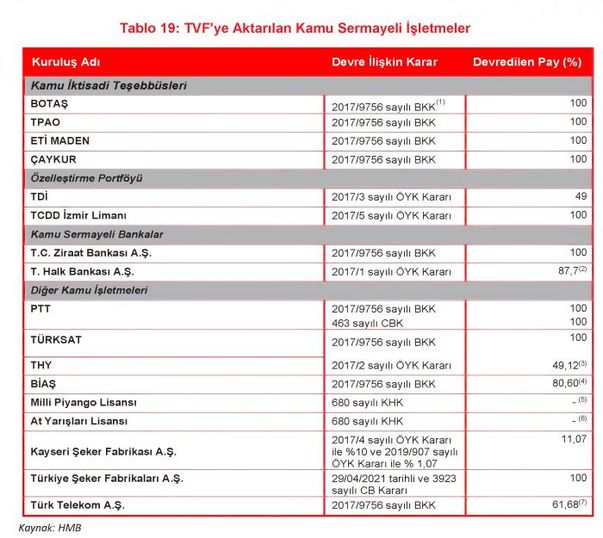 Raporda ayrıca 2021 yıl sonu itibarıyla Türkiye Varlık Fonu (TVF) portföyünde yer alan şirketler de paylaşıldı.