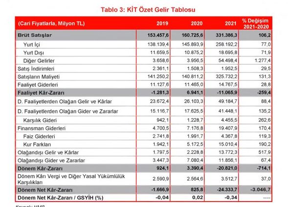 Performans açısından değerlendirildiğinde 2021 yılında KİT sisteminin brüt satışları 2020 yılına kıyasla yüzde 106.2 artışla 331.4 milyar liraya ulaştı. KİT sistemi, 2021 yılını yaklaşık 11,1 milyar lira faaliyet zararı ile kapattı. Söz konusu faaliyet zararının oluşmasında, brüt satışları bir önceki yıla göre yüzde 106.2 artarken, satış maliyetlerinin yüzde 131.3 artması etkili oldu. Vergi ve yasal yükümlülüklerinin ardından sistemin 2021 yılı dönem net zararı 24.3 milyar lira olarak gerçekleşti.