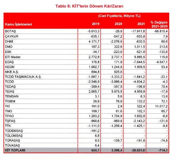 KİT'ler 2020 yılında 825.8 milyon lira net kâr açıklamıştı.