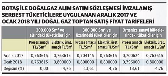 BOTAŞ ayrıca, proses amaçlı doğalgaz fiyatlarını da arttırdı. BOTAŞ, 2017'nin son ayında ısınma amaçlı doğalgaz dışındaki büyük ölçekli doğalgaz tüketicilerine uygulanan satış tarifelerinde yeni bir düzenlemeye gitmiş, proses amaçlı doğalgaz ile elektrik üretimi amaçlı doğalgaza uygulanan fiyatları birbirinden ayırmıştı. Ayrıştırma ile birlikte proses amaçlı kullanılan doğalgazın fiyatı sabit tutulurken, doğalgaz çevrim santrallerine verilen elektrik üretimi amaçlı doğalgazın metreküp fiyatı yüzde 8 oranında artırılmıştı.
