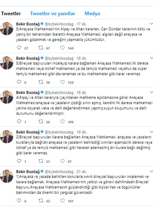 Başbakan Yardımcısı ve Hükümet Sözcüsü Bekir Bozdağ, Anayasa Mahkemesi'nin FETÖ sanığı gazeteciler Mehmet Altan ve Şahin Alpay ile ilgili verdiği 'Hak ihlali' kararına tepki gösterdi. Twitter hesabından paylaştığı 5 tweet ile kararı eleştiren Bozdağ, "Anayasa Mahkemesi temyiz mahkemesi gibi davranamaz dedi.