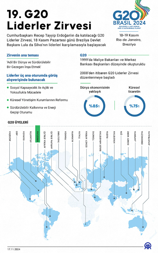Cumhurbaşkanı Recep Tayyip Erdoğan'ın da katılacağı G20 Liderler Zirvesi, 18 Kasım Pazartesi günü Brezilya Devlet Başkanı Lula da Silva'nın liderleri karşılamasıyla başlayacak.