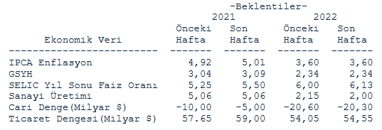 Brezilya Merkez Bankası'nın(COPOM) düzenlediği haftalık anket sonuçlarına şu şekilde: