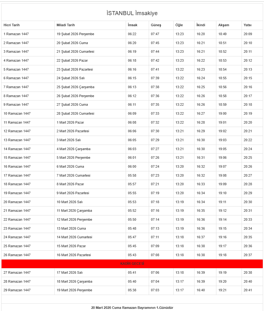 Diyanet İşleri Başkanlığı'nın yayımladığı İstanbul için imsak vakitleri şöyle: