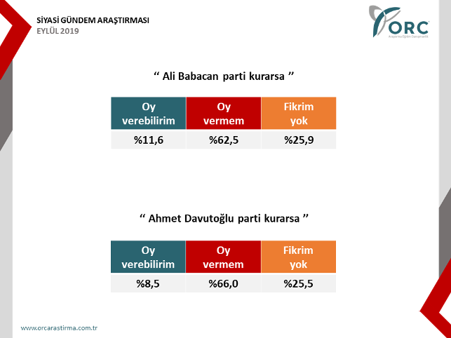 Anket sonuçlarına göre, Ali Babacan'ın parti kurması halinde "oy verebilirim" diyenler yüzde 11.6 iken, Davutoğlu'na ise yüzde 8.5'lik kesim "oy verebilirim" dedi.