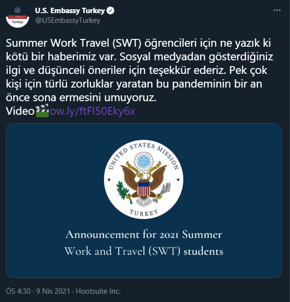 "Bu sezon "Summer Work and Travel" programına katılmayı isteyenler için kötü haberim var. Türkiye'deki ABD büyükelçiliği ve konsoloslukları, 2021 Summer Work and Travel sezonu için vaktinde vize veremeyecektir. Bu haberi sizlerle paylaşmanın hayal kırıklığı içerisindeyim;