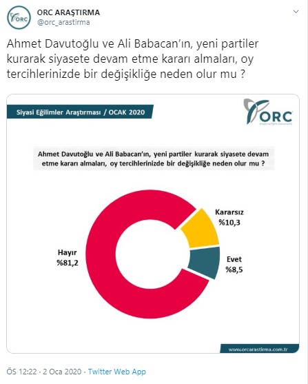 Öte yandan katılımcılara AK Parti'den ayrılan Ahmet Davutoğlu ve Ali Babacan'ın yeni partiler kurarak siyasete devam kararı almalarının oy tercihlerinde değişikliğe yol açıp açmayacağı da soruldu. Yüzde 8,5 değişikliğe neden olur derken yüzde 81,2'si hayır yanıtı verdi.