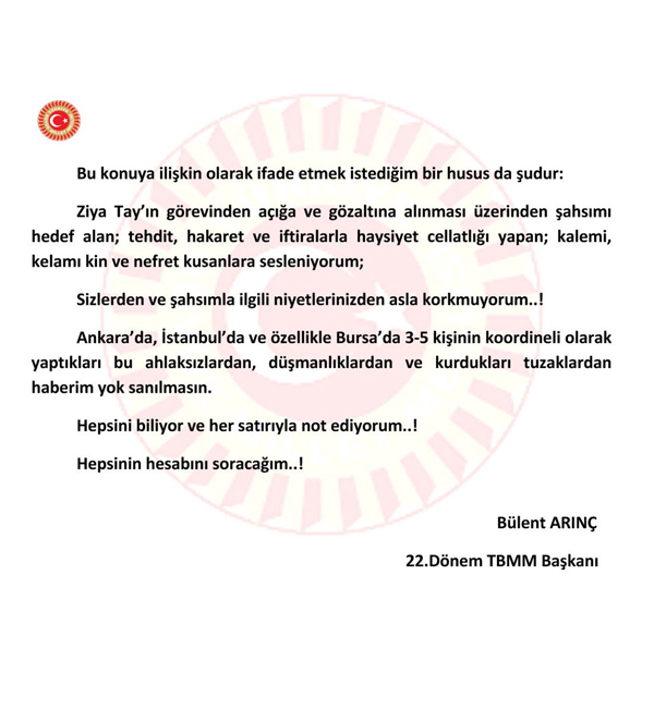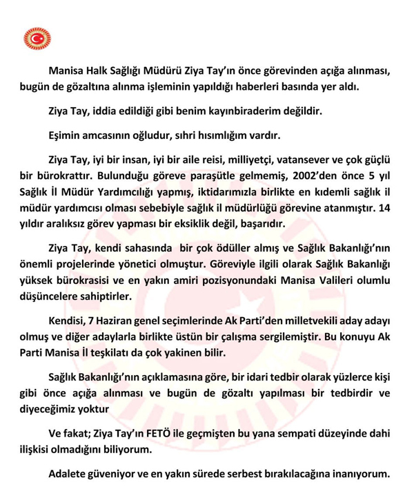 Arınç, gözaltına alınan Tay'ın kayınbiraderi olmadığını belirterek, 'Manisa İl Halk Sağlığı Müdürü Ziya Tay'ın önce görevinden açığa alınması, bugün de gözaltına alınma işleminin yapıldığı haberleri basında yer aldı. Ziya Tay, iddia edildiği gibi benim kayınbiraderim değildir. Eşimin amcasının oğludur, Sıhri hısımlığım vardır" dedi.