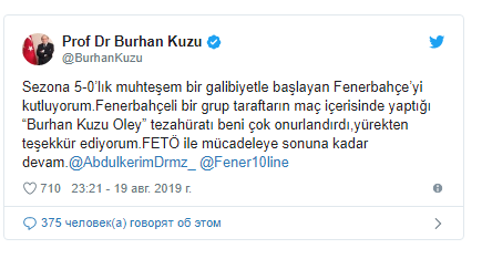 Kuzu, "Sezona 5-0'lık muhteşem bir galibiyetle başlayan Fenerbahçe'yi kutluyorum. Fenerbahçeli bir grup taraftarın maç içerisinde yaptığı 'Burhan Kuzu Oley' tezahüratı beni çok onurlandırdı, yürekten teşekkür ediyorum. FETÖ ile mücadeleye sonuna kadar devam" ifadelerini kullandı.