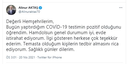 Genel durumunun iyi olduğunu ve evinde istirahat ettiğini aktaran Aktaş, temasta olduğu kişilerin de tedbir almasını istedi.