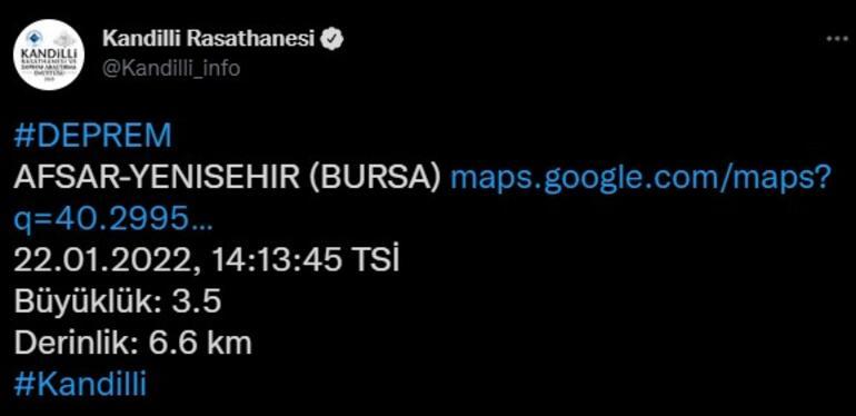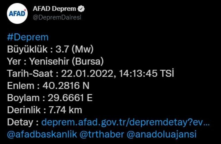 Bursa'nın Yenişehir ilçesinde 3.7 büyüklüğünde deprem meydana geldi. Saat 14.13'te yaşanan depremin derinliği 7.74 km. olarak açıklandı. Kandilli Rasathanesi ise depremin büyüklüğünü 3.5 olarak paylaştı.