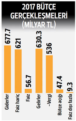 Maliye Bakanı Naci Ağbal, 2017 yılı bütçe açığının 47.4 milyar lira olarak gerçekleştiğini açıkladı. Bütçe açığı yılın başında 46.9 milyar lira olarak hedeflenmişti. Eylül ayında açıklanan Orta Vadeli Program’la (OVP) bütçe açığı 61.7 milyar liraya revize edilmişti. Ancak gerçekleşen bütçe açığı şaşırttı.