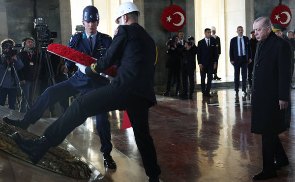Cumhurbaşkanı Erdoğan, kırmızı beyaz karanfillerden oluşan ay yıldızlı çelengi, Atatürk'ün mozolesine bıraktı.