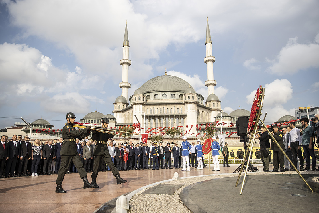 İstanbul Valiliğince Taksim Meydanı'nda düzenlenen törende İstanbul Valisi Ali Yerlikaya, 1. Ordu Komutanı Orgeneral Ali Sivri ve İstanbul Büyükşehir Belediye (İBB) Başkanı Ekrem İmamoğlu, Cumhuriyet Anıtı'na çelenk bıraktı.