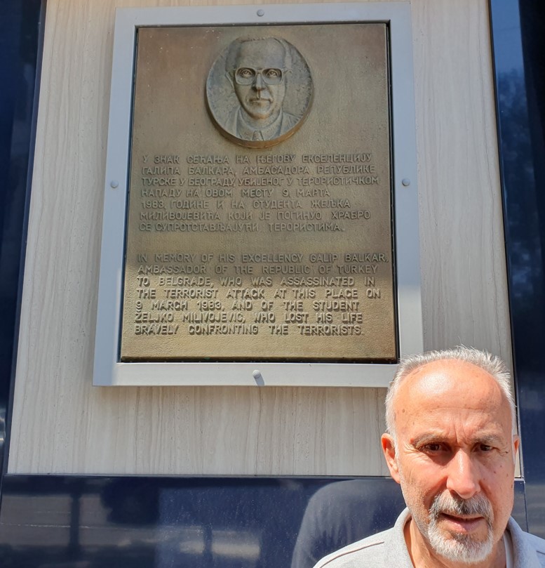Belgrad Büyükelçimiz Galip Balkar için vurulduğu caddeye konulan plaketin önünde...