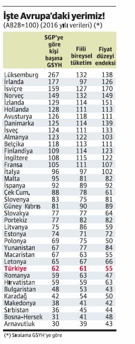 Avrupa'da satınalma gücü paritesine göre kişi başına gelirde bizden daha yoksul yalnızca sekiz ülke var. Bu ülkeler Romanya, Hırvatistan, Bulgaristan, Karadağ, Makedonya, Sırbistan, Bosna-Hersek ve Arnavutluk.