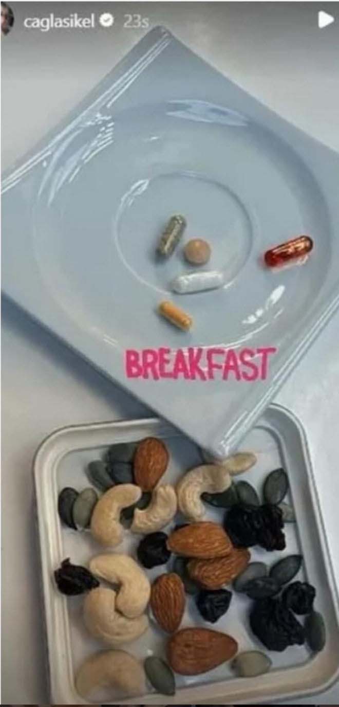 Sade ve sağlıklı beslenme alışkanlığıyla bilinen ünlü sunucunun kahvaltı tabağında kuruyemişler ve bazı takviye edici gıdalar yer aldı.