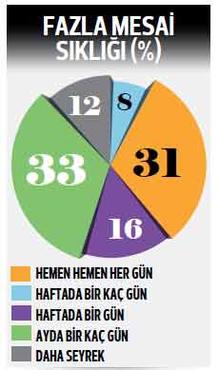 TÜRKİYE’de işçiler OECD ve Avrupa Birliği ortalamasının çok üstünde uzun saatler boyu çalışıyor. OECD verilerine göre ortalama çalışma süresi haftalık 40.4 saat iken, Türkiye’de 49.3 saat. AB ülkelerinde ise 37 saate kadar geriliyor. Araştırmaya göre sendikalı işçilerin yüzde 15’i, sendikasız işçilerin ise yüzde 28’i fazla çalıştırılıyor. Fazla çalşımanın genel ortalaması ise yüzde 24. Sigortasız işçilerin yüzde 39’u fazla çalışırken, sigortalılarda bu oran yüzde 22. Ücreti 1400 liradan az olan işçilerde fazla çalışma oranı yüzde 34. Raporda uzun çalşıma sürelerinin en önemli nedeninin fazla mesailer olduğu belirtilirken, düşük ücretlilerde oldukça yaygın olduğu görülüyor. Fazla mesai sıklığı da çarpıcı. İşçilerin yüzde 8’i hemen hemen her gün mesaiye kaldığını söylerken, haftada bir kaç gün kalanların oranı yüzde 31.