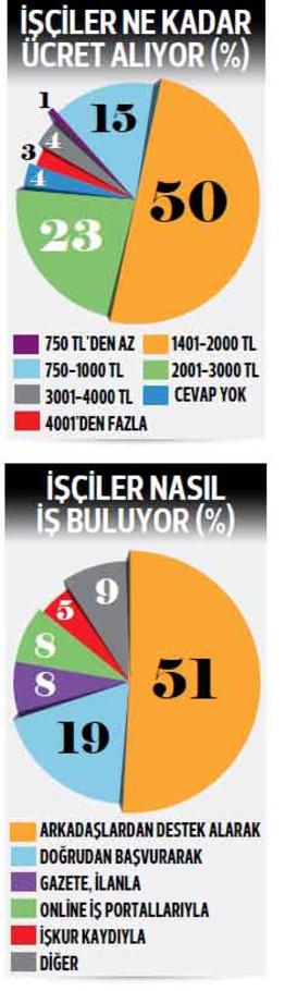 ARAŞTIRMAYA göre, işçilerin yüzde 51’i tanıdıkları veya arkadaşlarının desteğiyle işine yerleşmiş. İŞKUR’un buradaki oranı yüzde 5. İşsiz kalma süresi ise ortalama 1 ay. İşçilerin yüzde 15’i hemen iş bulduğunu belirtirken, 1 haftadan uzun işsiz kalanların oranı yüzde 14, bir ay ve daha uzun süre işsiz kalanların oranı ise yüzde 71. 1-4 hafta işsiz kalma oranı ise yüzde 23 ile öne çıkıyor. 1 yıldan uzun süredir işsiz olanların oranı ise yüzde 9 ile dikkat çekiyor.