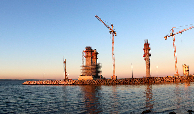 Denizin dibine çakılan demir kazıkların üzerine batırılan kule kesonları üzerine ilk bloklar ise geçen yılın Ağustos ayında konuldu ve kırmızı beyaz renkleriyle Türk bayrağını simgeleyen köprü ayakları yükselmeye başladı.