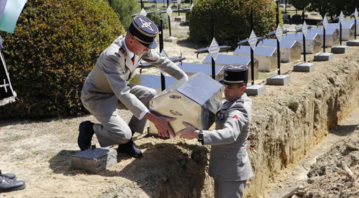 Konuşmaların ardından içerisinde askerlerin kemikleri bulunan önleyici konservasyon kutuları Fransız askerler tarafından tek tek bir aracı taşınarak konuldu. Morto Koyu'ndaki Fransız Mezarlığı'na götürülen askerlerin kemikleri burada törenle defnedildi.