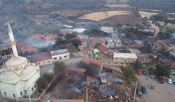 Bayramiç ilçesi Saçaklı köyünde devam eden orman yangınında çok sayıda ev zarar gördü. Bazı evler alevlerin etkisiyle yıkılırken, yangının verdiği zarar ise gün aydınlanınca ortaya çıktı. Yangından zarar gören köydeki evler ve orman havadan dron ile görüntülendi.