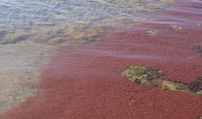 Bölgede iki gündür etkili olan fırtına nedeniyle kıyı kesimleri ile sahil bölgesi kırmızı alglerle kaplandı.