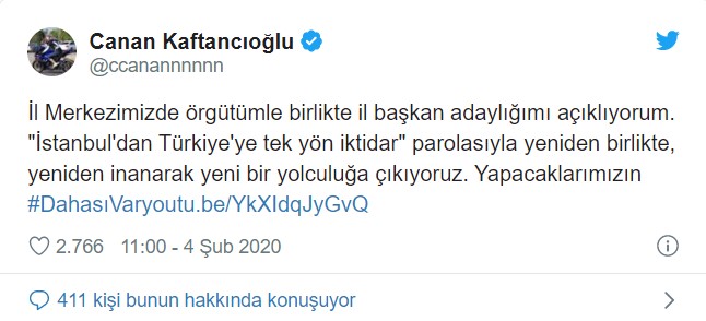 Kaftancıoğlu ayrıca Twitter'dan da bir açıklama yaparak "İl Merkezimizde örgütümle birlikte il başkan adaylığımı açıklıyorum. "İstanbul'dan Türkiye'ye tek yön iktidar" parolasıyla yeniden birlikte, yeniden inanarak yeni bir yolculuğa çıkıyoruz. Yapacaklarımızın #DahasıVar" ifadelerini kullandı.